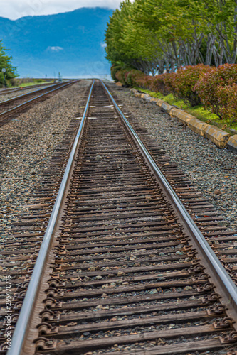 Fototapeta premium Railroad Tracks Curving into Distance toward Blue Mountains