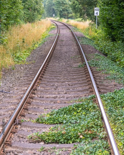 © Ulrich, Fototapeta premium Railroad tracks disappearing into the woods with speed limit sign