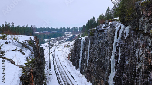 © Musawar, Obraz premium Railroad tracks in a wintry landscape between two mountains