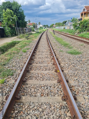 © Agnes, Fototapeta premium railroad tracks in the forest urban viilage