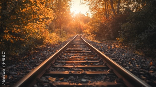 © Crafted, Obraz premium Railroad tracks leading to a bright sunset through a forest in autumn.