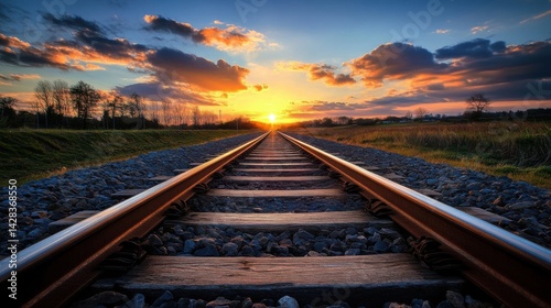 © Visual Symphony, Fototapeta premium Railroad tracks leading to the horizon with a sunset in the background.