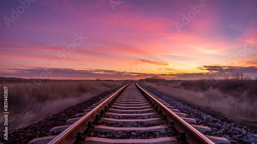 © Emilia, Fototapeta premium Railroad Tracks Leading to Vibrant Sunset with Infinite Perspective