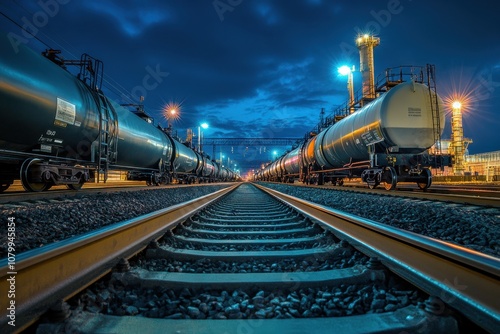 Naklejka premium Railroad tracks leading towards a line of tanker cars at dusk.
