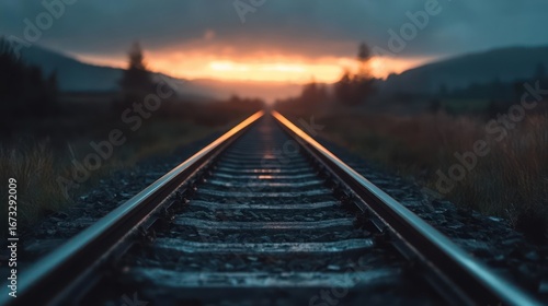 Fototapeta premium Railroad tracks stretch into the distance toward a vibrant sunset horizon...