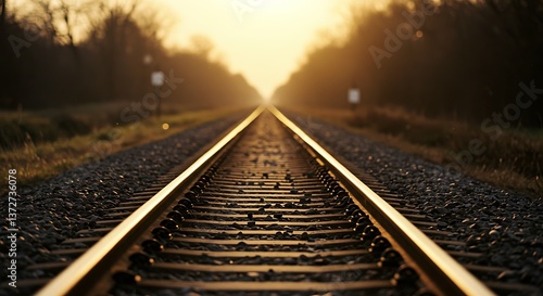 Fototapeta premium Railroad Tracks Stretching to the Horizon with Golden Sunset Light