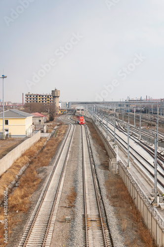 Naklejka premium Railroad tracks through Chinese city of Zhaodong