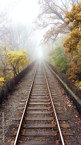 Fototapeta premium Railroad tracks through foggy autumn woods