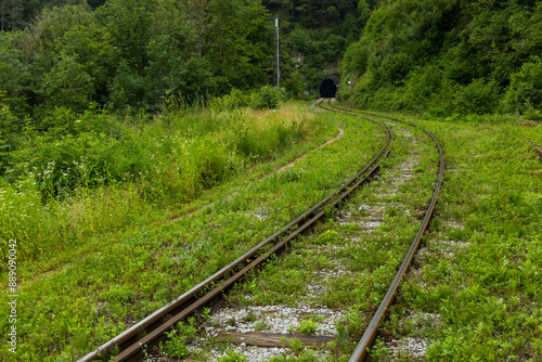 Fototapeta premium Railroad tracks, tunnel with train tracks, railway signs, ancient railway...