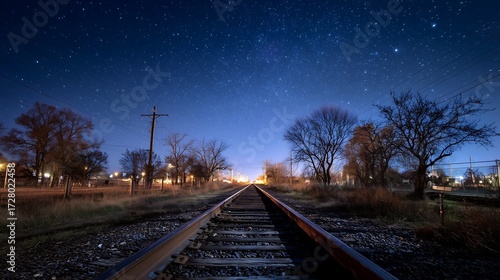© Ayu, Fototapeta premium Railroad tracks under starry night sky