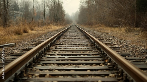 © musa, Fototapeta premium Railroad tracks vanishing into a misty autumn forest.