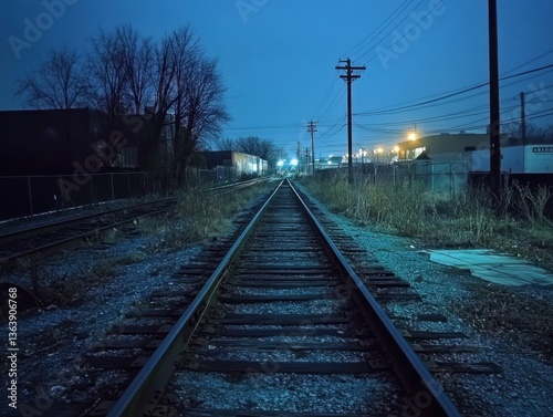 Fototapeta premium Railroad tracks vanishing into distance with cool blue hour lighting and...