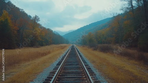 Fototapeta premium Railroad tracks vanishing into misty autumn mountains.