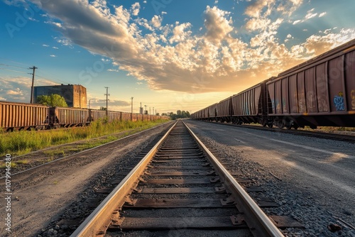 © Art Jabz, Obraz premium Railroad tracks vanishing into the distance at sunset.