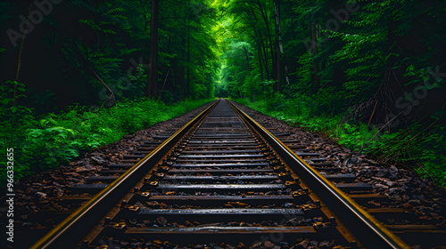 Fototapeta premium Railroad Tracks Winding Through Green Forest