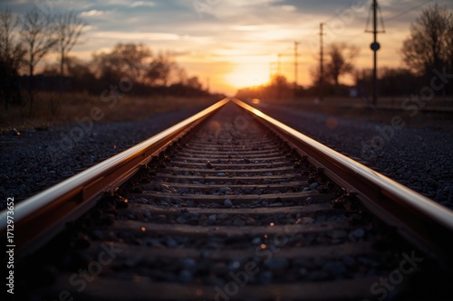 © vxnaghiyev, Fototapeta premium Rails and signals set for the upcoming train at daybreak