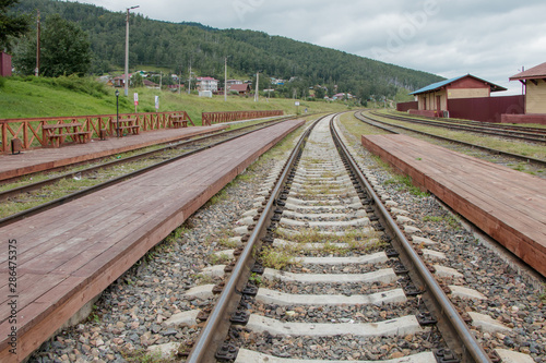 © IrinaK, Naklejka premium Rails extending into the distance. Close-up.