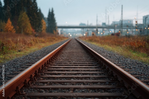 © Maria, Fototapeta premium Rails stretch into distance, framed by autumn foliage and urban