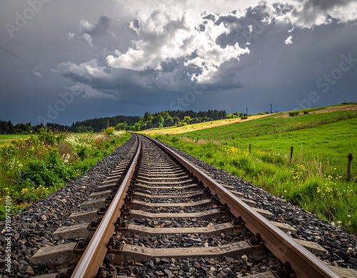 © Rendang, Fototapeta premium Rails stretching towards the horizon under a dramatic, cloudy sky