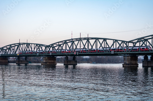 © Lukas, Obraz premium Railway bridge over the Danube River in Vienna, Austria during sunset