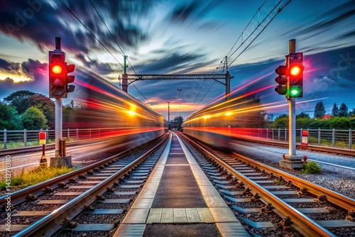 Obraz premium Railway Crossing Safety: Train Approaching, Signals & Barriers Active - Stock...