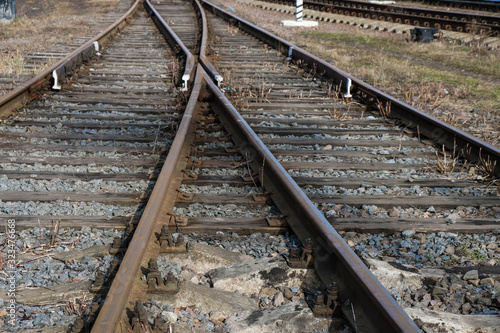 Fototapeta premium Railway fragment in Ukraine. Joint of rails. Close up. Choice concept.