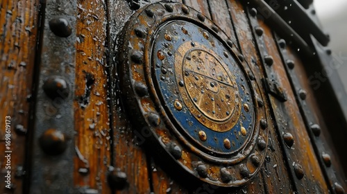 © Igor, Fototapeta premium Railway insignia heritage train emblem PHI&EM shield badge on weathered locomotive side with warm sunset light vintage railroad transportation classic railroading