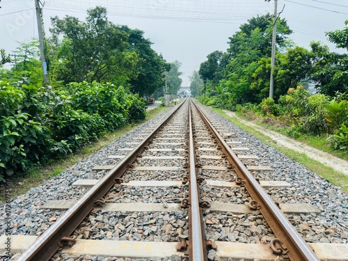 © Hafizur, Obraz premium Railway line in the middle, green trees on both sides and blue sky above.