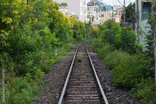Naklejka premium Railway line through urban area with green trees and houses and buildings in...