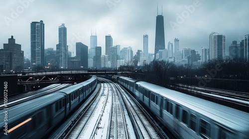 Fototapeta premium Railway overpass with a sleek modern train speeding across, urban skyline in...
