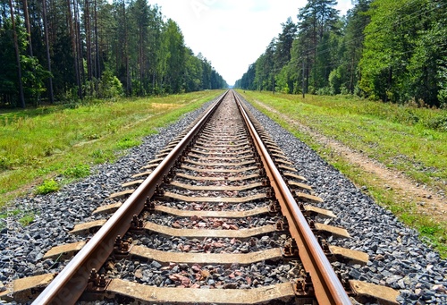 © Anastassiya, Fototapeta premium railway running into the distance, surrounded by forest on both sides