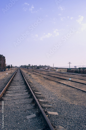 © imdproduction, Naklejka premium Railway station against beautiful sky at sunset.