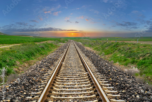 © Bulent, Fototapeta premium Railway stretching through greenery. Setting sun, sunset with blue cloudy sky landscape in the background