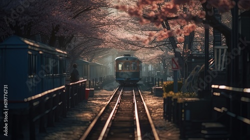 Naklejka premium Railway surrounded by cherry blossoms. Generative AI