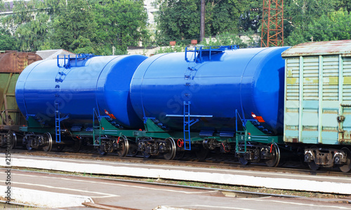 © evastar, Naklejka premium Railway tanks. Copy space. Set of tanks with oil and fuel transport by rail. Gasoline tanker railroad