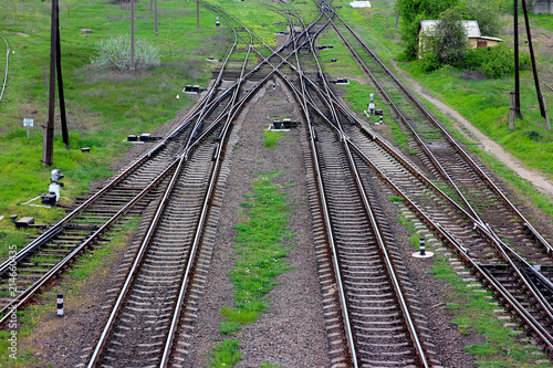 Obraz premium Railway, the top view on rails. Leading parallel steel rails with regular...