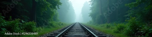 Fototapeta premium Railway track disappears into the misty veil of a forest, mist, serene