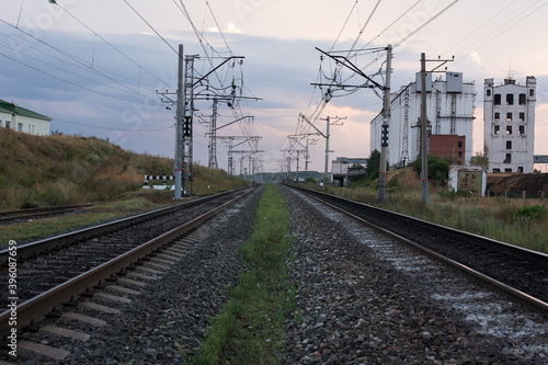 © Shamil, Fototapeta premium Railway track, power lines and grain elevator