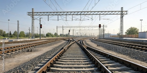 Obraz premium Railway track with multiple switches and interchanges in a complex layout, switch, tracks, freight