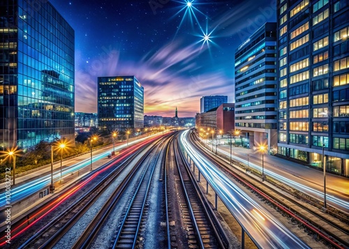 © Adisorn, Fototapeta premium Railway Tracks and Modern Office Building at Night - Time Lapse Cityscape Photography