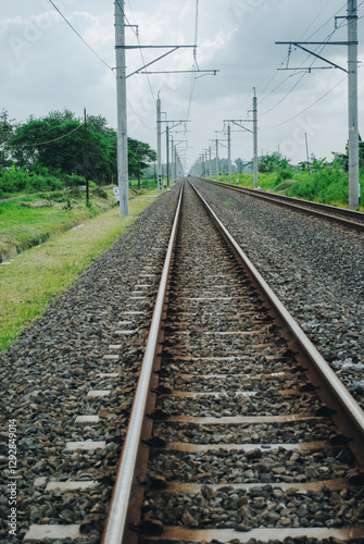 © Dimas, Obraz premium Railway tracks crossing green rice fields, Klaten, Central Java, Indonesia