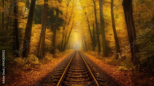 © sujitea, Fototapeta premium Railway Tracks Disappearing Into Thick Autumn Forest