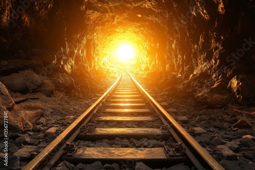 Naklejka premium Railway tracks extend into a glowing tunnel at sunset showing a bright light...