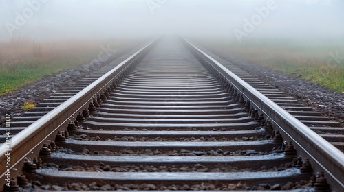 Fototapeta premium Railway tracks extending into misty horizon. Ideal for journey metaphors,...