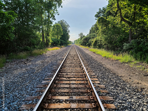 Obraz premium Railway tracks extending to the horizon, running in between the green forest.