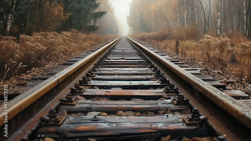 © Shipons Creative, Naklejka premium Railway tracks in a field with dry grass and blue sky