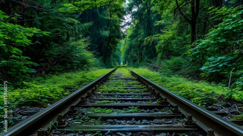 © horizon, Fototapeta premium Railway tracks in a forest, with green trees on both sides. The photograph is in the style of railway tracks in a forest.