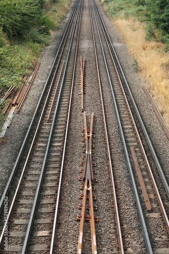 © Natalia, Fototapeta premium Railway tracks laid outside the city. A vertical image.