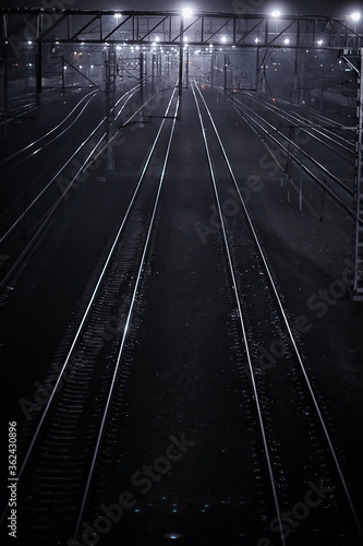 Fototapeta premium railway tracks night landscape at the railway station fog autumn