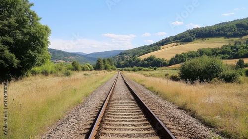 © sergiokat, Fototapeta premium Railway Tracks Stretch Through a Lush Landscape Under a Clear Blue Sky, Leading the Eye to Distant Rolling Hills